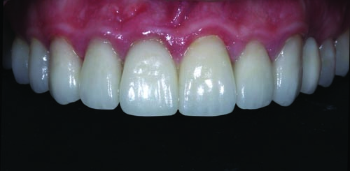 Fig. 29: View of the long-term provisional restorations after insertion at the second appointment. The third appointment was scheduled for four months later, during which time final preparation and refinement of teeth #2 through #14 was performed and final impressions were taken.