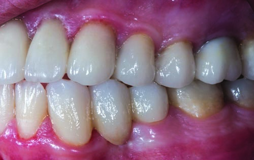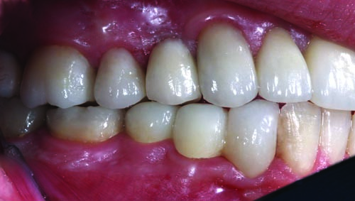 Fig. 4: The preoperative left lateral view reveals that any treatment undertaken should address the patient’s numerous missing teeth, including #12, #15, #16 and #17 and multiple MOD amalgam restorations on teeth #13, #14 and #18 through #21.