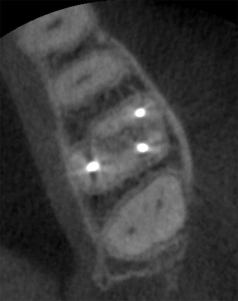 Fig 4b: Instrumentation was completed with Vortex Blue from Dentsply Sirona, a 500rpm, constant tapered file with excellent cutting efficiency. The postoperative image shows the files were able to follow the natural curves of the canal in multiple planes as the MB and ML canals joined in the apical half of the root.