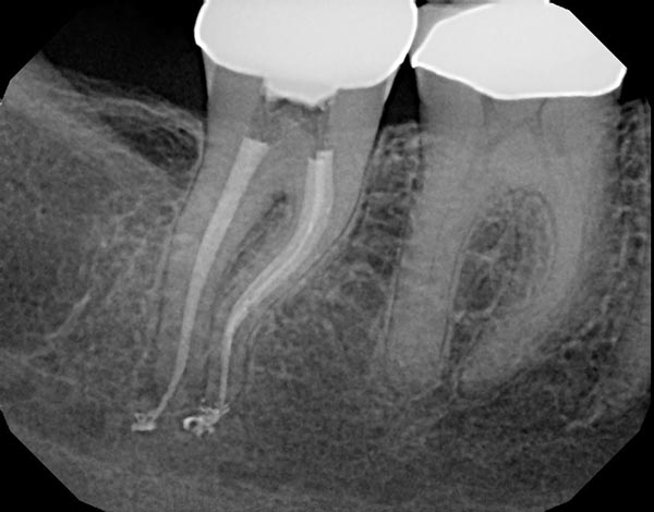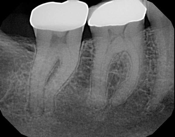 Fig. 4a: Preoperative image of tooth #31 with an irreversible pulpitis. The mesial roots have a subtle “S”-shaped curve and the preoperative working length was estimated to be 23mm. It was also assumed preoperatively that the MB and ML canals would be in close approximation or connected in the apical half of the root. This anatomy requires a flexible and efficient instrument with a good degree of torque strength.