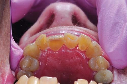 Extensive incisal-edge caries is typical of patients with xerostomia. I have performed many restorations where the dentin is eroded and no longer supports the enamel edge. In these cases, the dentin is prepped deeper to provide enhanced retention and longer life, and then the bioactive composite is placed, which helps prevent incisal caries while supporting the brittle enamel.