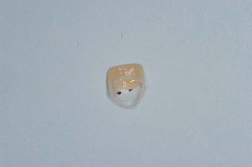 Fig. 4: The junction to the facial enamel is marked on the crown form. The incisal edge of the crown form is perforated at both corners with an explorer tip to allow for venting of air. The perforation is made from the internal aspect outward,