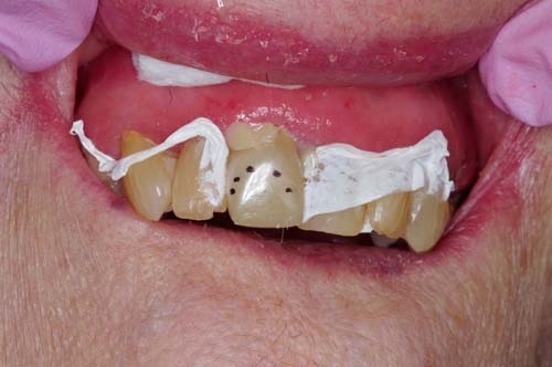 When a strip crown is used with composite material, it can distort the crown or shift it slightly off axis, because of the high viscosity of conventional composite material. I chose a bioactive composite material (Activa Bioactive-Restorative from Pulpdent) for this case because it would flow into and fill the crown form, seat accurately, and allow air to vent through perforations in the incisal edge of the plastic form. From experience, I knew that this material can withstand impact forces and shows high resistance to wear and recurrent caries, which was of great importance in this highly cariogenic mouth.