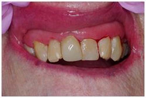 Fig. 7: Because part of this treatment plan was to improve aesthetics, the mesial-incisal overlap was reduced. The final result improves her appearance, provides function for her remaining life, and facilitates hygiene.