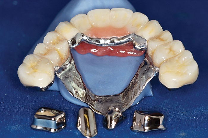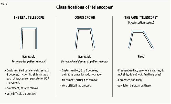 The double-crown technique is considered to be the “king’s class” of dental restorations in Germany. I was fortunate to learn the technique from two of its inventors in 1980. In essence, the double-crown technique describes two different systems of a crown or superstructure sitting atop a primary coping or abutment—telescope crowns and conus crowns. The fundamental difference: Telescopes glide easily on top of each other while maintaining friction fit and are easily removed by the patient. Conus crowns do not glide; they lock in a final, definite position and require substantial force of removal, which gets greater the longer the patient wears it. Implants and milled bars can also fall into these classifications.