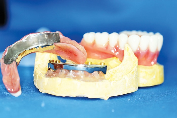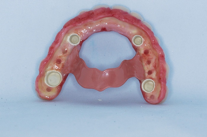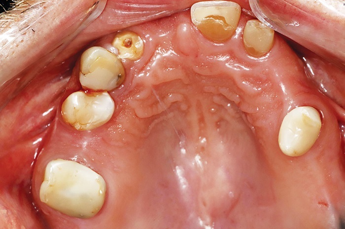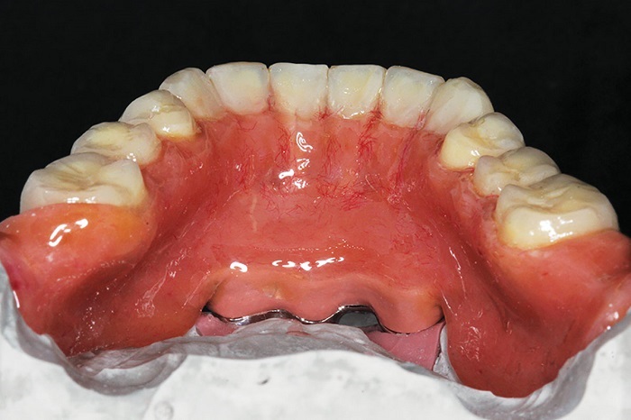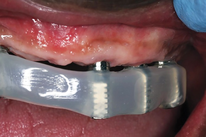 Instruct the patient how to gently insert the denture until fully seated, and stress the point that he or she cannot “bite” the denture home, because this will damage the intaglio and lead to loss of friction fit. The patient should treat it like a denture: gentle in, gentle out. When removing it, it should be grabbed on both sides—never on one side only, which will tilt and lock the position.