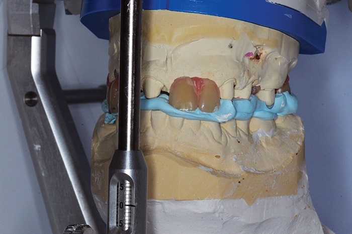 After try-in, the setup is remounted with the confirmed bite and is transferred for the design of the primary copings (Figs. 18–21). We need the dimensions and positions to match into the design.