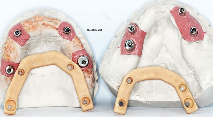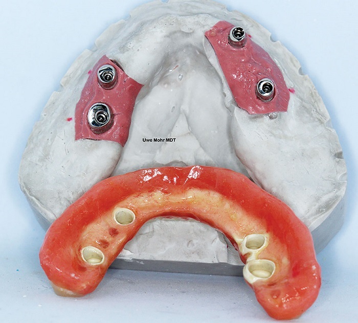 The basic principle: The denture or superstructure is used to seat those primary telescopes that will be cemented home. Implant abutments can be seated as usual or with the help of the seating jig.