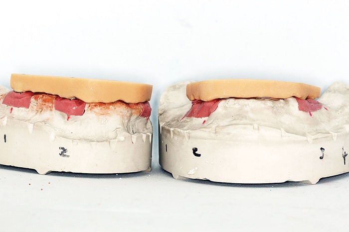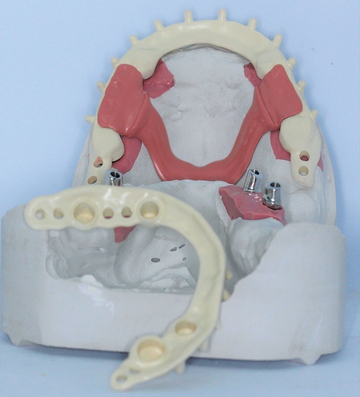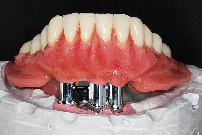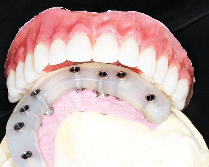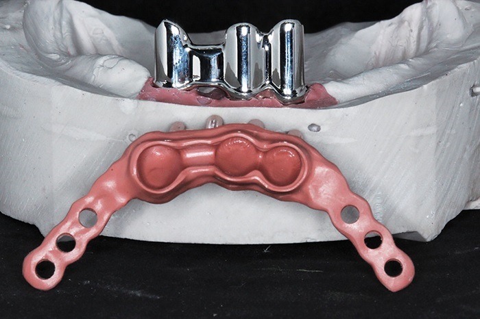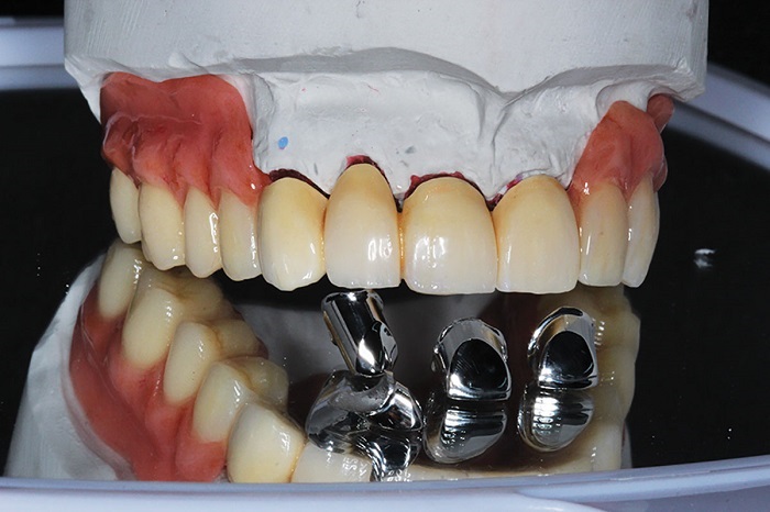 Separately confirm the tooth setup and make all adjustments as needed. Verify bite, confirm with new CR registration. If there is a second try-in with the superstructure or frame, proceed as above for copings and abutments, then seat the denture or secondary frame over it.