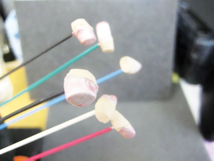Paint the intaglio of the secondary frame with Vaseline anywhere the frame might come into contact with your cement or bonding agent. The Vaseline will push any cement accidentally getting into the intaglio out and prevent it from sticking to the PEEK frame. Arrange your primary telescopes in seating sequence—you will need quick hands in a moment!