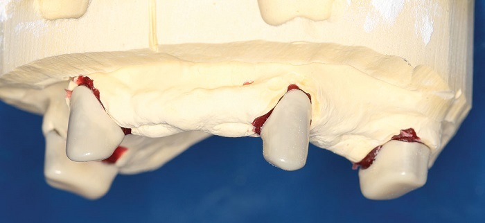 The procedure for analog manufacturing is similar. The wax-up is milled, cast and sent for a pickup impression, so a new master model can be generated (Figs. 22 and 23).