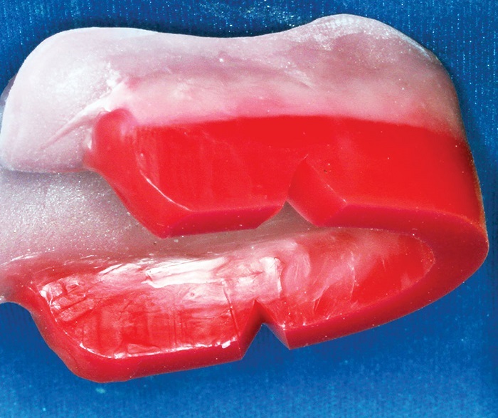 Denture tooth setup and diagnostic wax-up are done simultaneously to work out dimensions and positions and incorporate the incisal A&B point generated by the Kois Analyzer (Figs. 14 and 15). From this, we generate temporary matrices (Figs. 16 and 17) for the dentist to temporize the patient in the established CR and with function and aesthetics as close as possible to the desired final outcome. We can also turn the setup into a temporary denture to go with this.