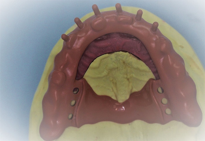 With these steps we can accurately design position and dimension of the primary telescope or abutment. The telescopes show studs for extra retention in the pickup impression.