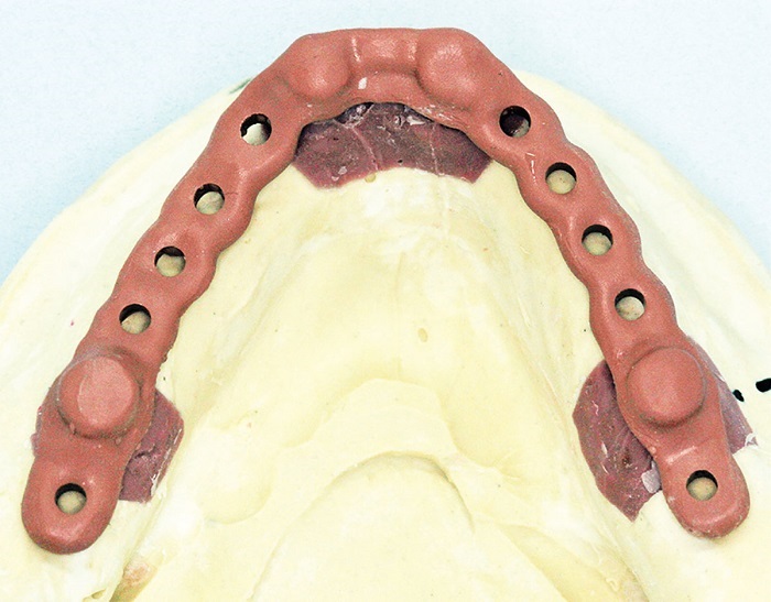 Zero-degree milled bar with locators and friction fit CAD/CAM-milled titanium superstructure: The milled bar and the superstructure are one telescope in function, providing friction fit and load distribution over the entire structure, preventing the locators from becoming load-bearing. The locators are strictly a retentive element, as they should be (Figs. 78 and 79).