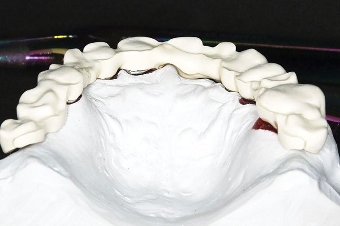 The denture teeth get bonded onto the retentions using GC Gradia Plus composite before the rest of the superstructure is finished (Figs. 60 and 61).