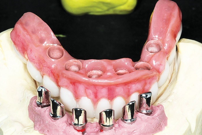 The most common failure complaint for traditional hybrid prostheses is the debonding or breaking off of denture teeth. This is due to lack of mechanical retention and poor processing protocols. To prevent this, we generate individual retentions whenever anterior teeth are involved, supporting each tooth (Figs. 58 and 59).