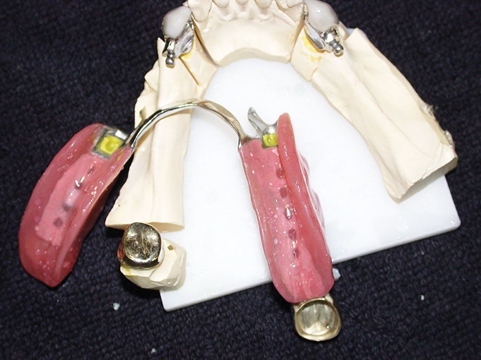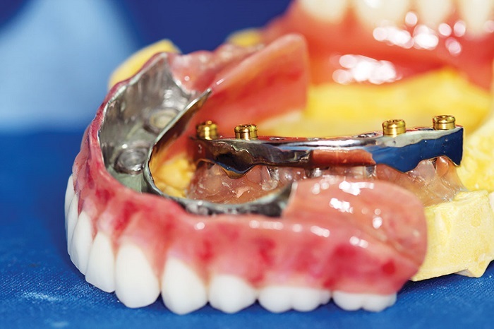 Final insertion: First steps as above for frame/denture try-in. Remove from mouth, remove the primary copings from the denture using jacket grips, and thoroughly clean the telescopes and secondary frame.