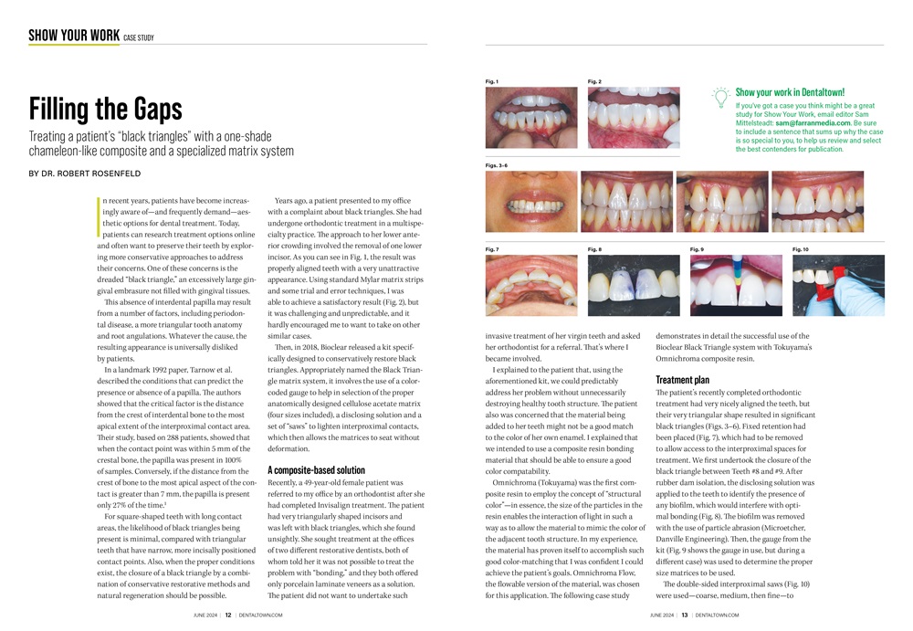 The technique shown here using the Bioclear Black Triangle System and Omnichroma flowable composite is not difficult to master—instructional videos can be found on YouTube—and it can be a very worthwhile addition to your treatment offerings.