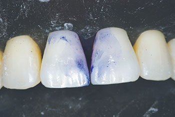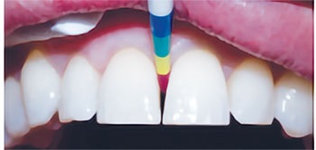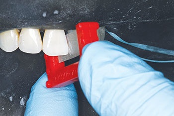 The patient’s recently completed orthodontic treatment had very nicely aligned the teeth, but their very triangular shape resulted in significant black triangles (Figs. 3–6). Fixed retention had been placed (Fig. 7), which had to be removed to allow access to the interproximal spaces for treatment. We first undertook the closure of the black triangle between Teeth #8 and #9. After rubber dam isolation, the disclosing solution was applied to the teeth to identify the presence of any biofilm, which would interfere with optimal bonding (Fig. 8). The biofilm was removed with the use of particle abrasion (Microetcher, Danville Engineering). Then, the gauge from the kit (Fig. 9 shows the gauge in use, but during a different case) was used to determine the proper size matrices to be used.