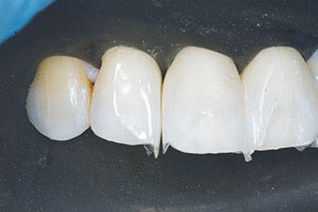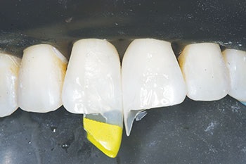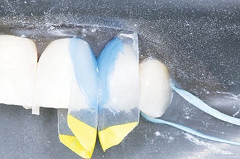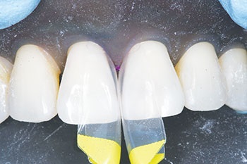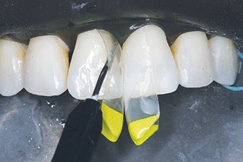 I explained to the patient that, using the aforementioned kit, we could predictably address her problem without unnecessarily destroying healthy tooth structure. The patient also was concerned that the material being added to her teeth might not be a good match to the color of her own enamel. I explained that we intended to use a composite resin bonding material that should be able to ensure a good color compatibility.