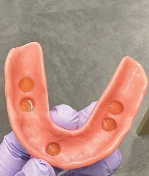 Digital dentistry revolutionizes this process. For digital dentures, instead of a wax try-in appointment, we have functional try-ins. The digital dentures are printed in the real denture material instead of wax (Fig. 1), so patients can try them on and smile, bite, and talk normally to see how the dentures feel.