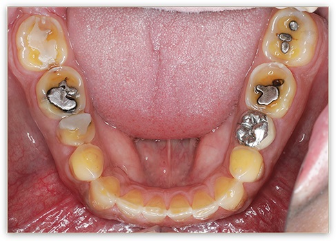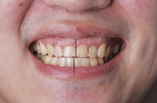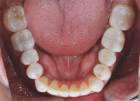 To develop the mandibular posterior occlusal plane, we lengthened teeth #18–#21 and #28–#31 by 0.5 mm–1 mm to level the plane (Figs. 10a and 10b). We noted that the intra-arch midline was slightly off. The patient said it didn’t bother him, so no alteration was planned (Fig. 11).