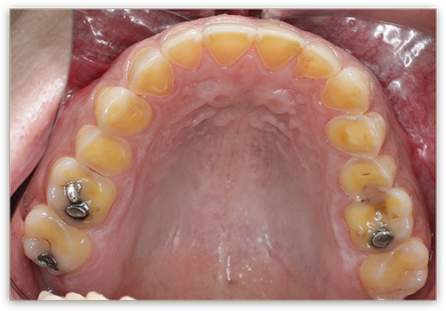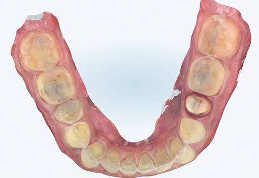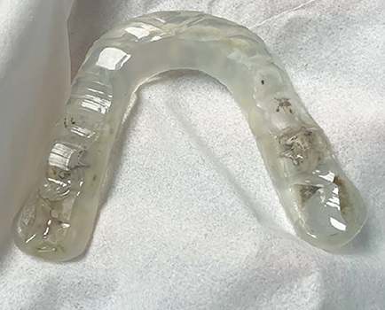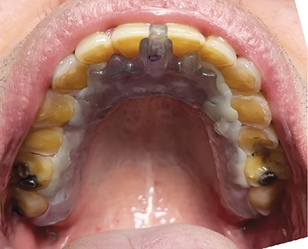 Functional: The patient reported noticing both clenching and grinding in the daytime, and his spouse heard him grinding at night. The patient had been wearing a nightguard for the past 10 years. The upper nightguard made two years ago showed linear lateral movements (Fig. 2), a sign of parafunctional bruxism at night. The patient has an abnormal neuromuscular habitual bruxism, with severe attrition on all natural teeth. His functional diagnosis was occlusal dysfunction and parafunction, which placed the patient at a high risk in the functional risk assessment because he had excessive bite force and excessive wear on teeth.