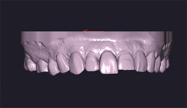Test drive smile: Using our diagnostic wax up, a putty matrix was made using Ivoclar Sil-Tech. A bisacryl temp (DMG America Luxatemp) in shade B1 was injected into the putty matrix and placed. After the excess was removed and occlusion was balanced, we scanned the patient’s teeth with the mold in his mouth using an iTero scanner (Fig. 12).