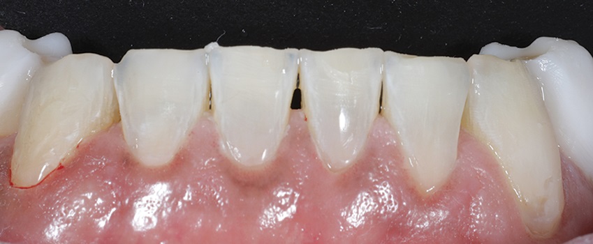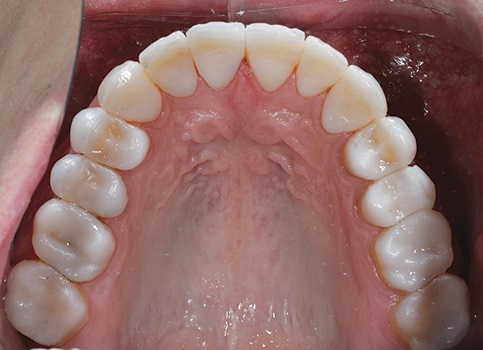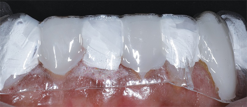The patient wore the deprogrammer for one week. Composite resin was placed in the interproximal areas of the deprogrammer and light cured in the patient’s mouth for extra retention on the lingual (Fig. 5).