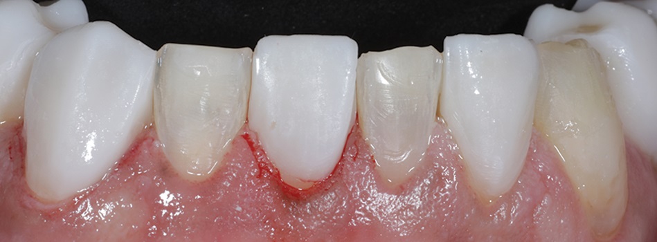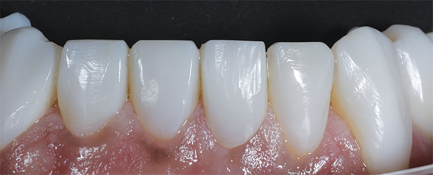 Gingival tissue assessment: Patient has a high lip dynamic and shows more gingival tissue than what is considered aesthetically pleasing. We crown lengthened teeth #7–#10 to match canines #6 and #11(Fig. 15a–b).