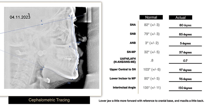 Lateral ceph measurements: SNA was 80 degrees and SNB measured 85 degrees (normal being 82 and 79 degrees, respectively). The patient’s lateral ceph measurement (Fig. 3) shows the lower jaw is a little more forward with reference to the cranial base, and the maxilla is a little back.