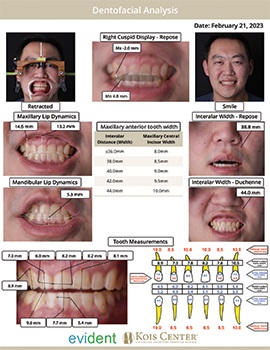 Dentofacial: Using Kois Facial Reference Glasses 3.0 and photos of the patient in different smile poses—repose, Duchenne and teeth-separated retracted view (Fig. 4)—a dentofacial analysis was performed that showed the patient’s right cuspid display in repose at –2 mm. The patient had a high lip dynamic and an excessive display of teeth.