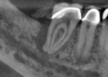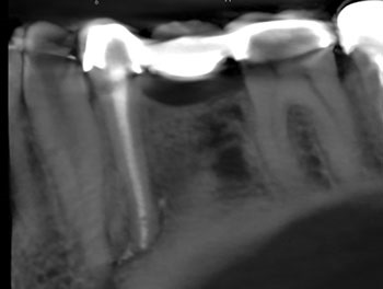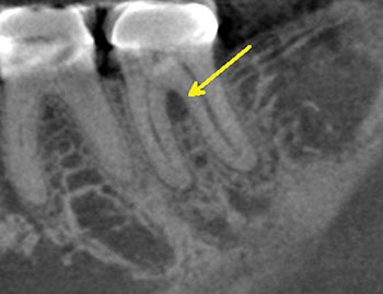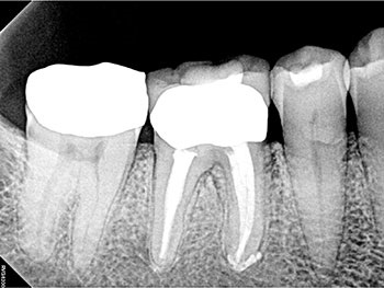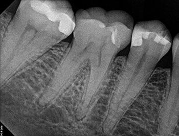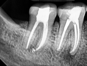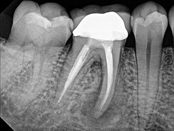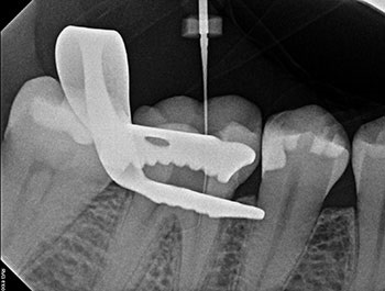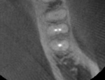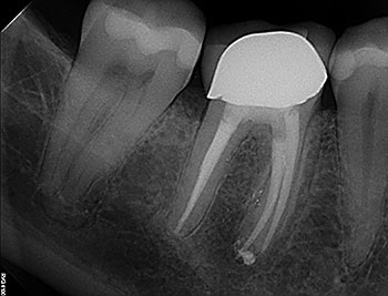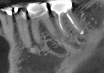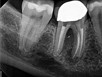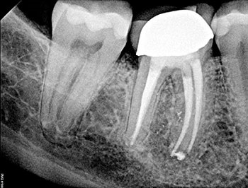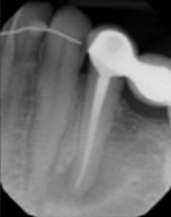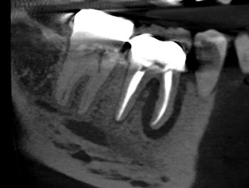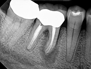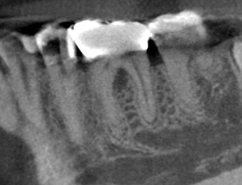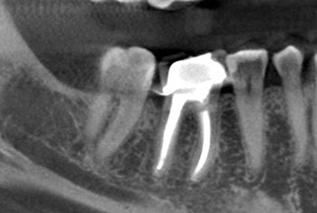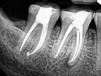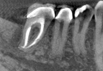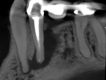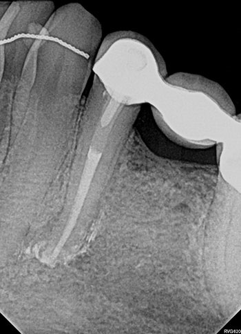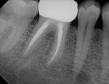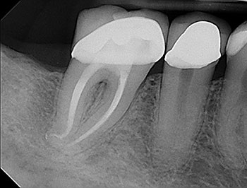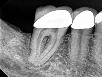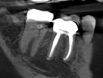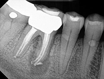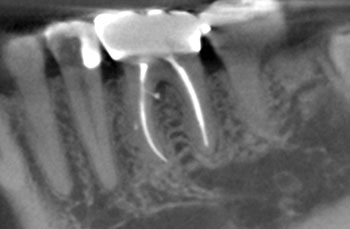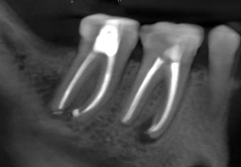 Tooth #31—the tooth that was more likely to be fractured—was addressed first. To maximize the likelihood of healing, this tooth was treated in multiple visits using a calcium hydroxide intracanal medicament and obturated after bony healing was complete. The patient was delighted that his tooth had been saved, but also somewhat perplexed that the original endodontist gave up on a tooth that could have been saved. He has now scheduled re-treatment for tooth #30.