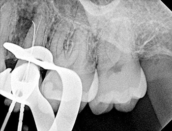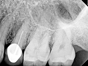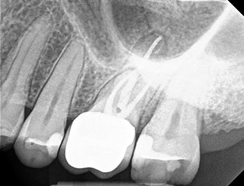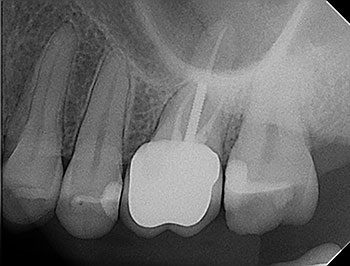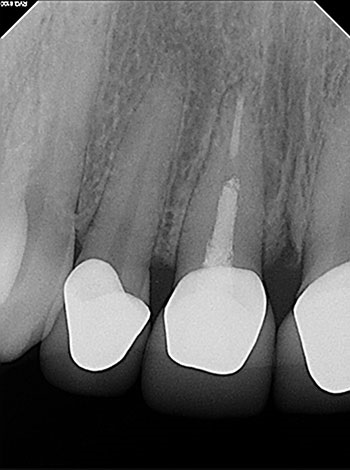After the buildup and root-filling material were removed, a microscope was used to confirm that no cracks were present in the pulp chamber or the coronal third of the canals. This tooth was treated in multiple visits using calcium hydroxide, an antimicrobial intracanal medicament, and to confirm healing. The root canal system was cleaned, calcium hydroxide was placed, and a double-layered long-term provisional restoration made of Cavit and bonded composite were placed to seal the access preparation.