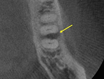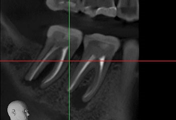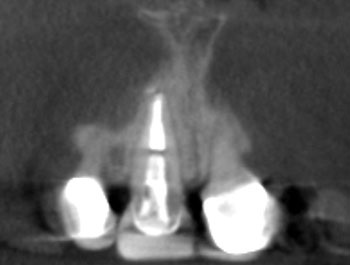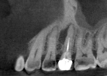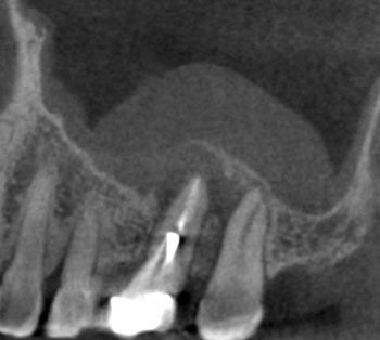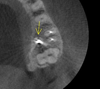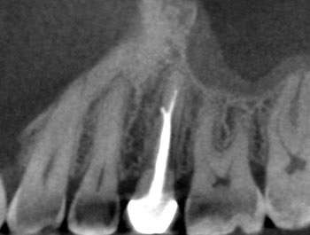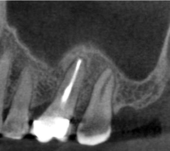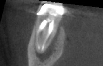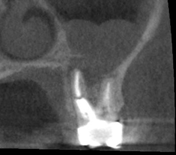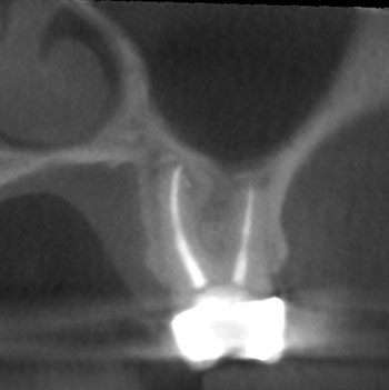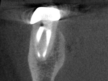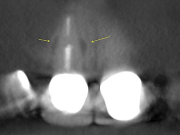 When radiopaque dental materials, such as obturations or posts, are present in the same plane as the root, CBCT is not effective in identifying VRF. Reconstruction artifacts often present as dark lines that can be misinterpreted as cracks. Furthermore, posts generally look larger than they really are on the CBCT and often appear to perforate root surfaces when they are not. This tooth was not cracked. The periradicular tissues healed completely following nonsurgical re-treatment.