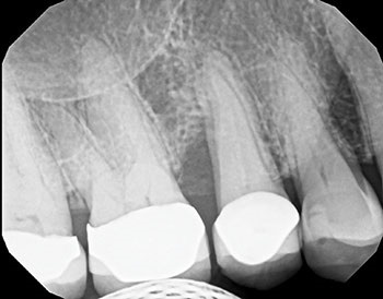 Earlier X-rays from the patient’s previous dentist showed no visible periodontal problems or open contacts between teeth. The patient had likely been slowly getting food stuck in this upper left quadrant, compromising the epithelial attachment and contributing to the gradual drifting of the teeth.1