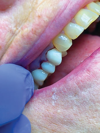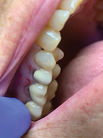 Time-saving workflow tip: A void was noticed on the entire mesial of tooth #12, which was not captured in the Access Crown material. This was easily corrected by removing a small amount of the material with a diamond bur, adding a slight amount of Access Crown material, allowing it to set, and then carving it into shape. The result was a perfect repair. The self-additive property of Access Crown has proven to be a time-saving and useful benefit in such situations.