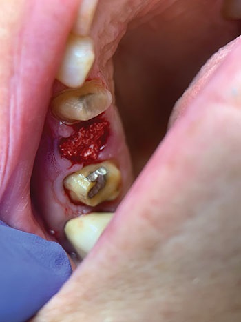 Fig. 5: Tooth #13 extracted. Extraction socket protected with a non-toxic hydrogel wound dressing and hemostatic selfresorbing gauze.
