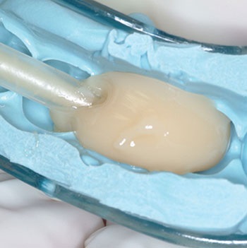 The dental impression taken earlier was dried with moisture-free blown air to begin making a three-unit temporary bridge. Access Crown Temporary Crown and Bridge Material (Centrix, Inc.) was prepared and dispensed directly into the impression matrix from the bottom up, submerging the dispensing tip until the matrix was three-quarters full (Fig. 6). When the impression matrix was ready (within 30 seconds), it was positioned in the patient’s mouth. The material was set in place for 60 seconds (90 seconds from the beginning of the mix) and then removed from the mouth.