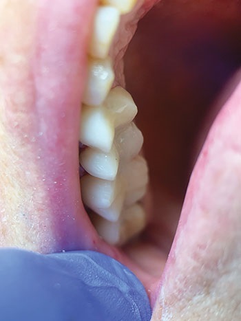 A non-eugenol temporary cement was used to adhere the temporary bridge to the prepared teeth, as non-eugenol cement is easier to remove than resin-based cement (Figs. 7 and 8). The entire appointment took 1.5 hours. The patient scheduled an appointment to return in eight weeks for a digitally scanned dental impression and to begin procedures for a permanent fixed bridge.