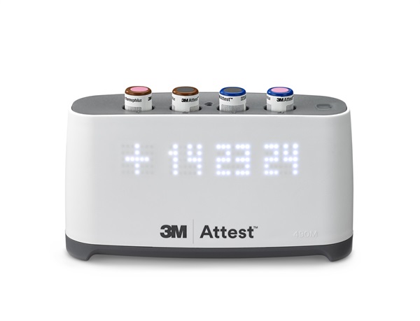 ST. PAUL, Minn – 3M announces the 3M Attest Mini Auto-reader 490M. With the small, easy-to-use Attest Mini Auto-reader, dental practices can access the same rapid 24-minute sterilization monitoring speed used in hospitals to better serve patients. The Auto-reader is designed to incubate and read 3M Attest Super Rapid Readout Biological Indicators 1491 and 1492V for a final fluorescent result in 24 minutes. Dental teams will no longer have extensive waits for results and will now know that their sterilizer cycle parameters have been met.