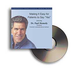 CareCredit® is offering free to practices, a new educational audio CD titled, “Making It Easy For Patients To Say ‘Yes’” featuring Dr. Paul Homoly, President of Homoly Communications Institute, an organization dedicated to the development of high performance dental teams and the advance of leadership and communication in dentistry worldwide. Dr. Homoly is a world-class leader in dental education and has published three books, Dentists: An Endangered Species, Isn’t It Wonderful When Patients Say “Yes,” and Making It Easy For Patients To Say “Yes.”