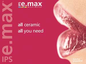 With the introduction of IPS e.max, dentists can now confidently write a prescription for metal-free, all-ceramic restorations regardless of the esthetic, functional or complex requirements of the case and know that they will be completed with a singular smile design chemistry. For laboratories, IPS e.max represents the ultimate in productivity, performance and esthetics by eliminating the need for inventorying multiple porcelains, streamlining the training of ceramists and minimizing costly mistakes that result from using incompatible layering materials.