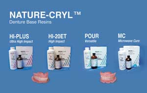 GC America, Inc., a leading manufacturer of dental polymers introduces the NATURE-CRYL Family of Denture Base Materials consisting of 2 High Impact denture materials, (NATURE-CRYL HI-PLUS & NATURE-CRYL HI-20ET), NATURE-CRYL POUR and NATURE-CRYL MC. For the first time, one brand of denture base materials is available to meet ALL the needs of the patient, dentist and laboratory. Each of the NATURE-CRYL Products are available in a harmonized shade system consisting of 7 popular shades including the 3 COE-LOR™ heavily pigmented ethnic shades makes it the most complete shade system in the industry. It is available for use in the most popular processing techniques including heat cure, fast heat cure, microwave, pour and reline & repair. Benefit from shade matching across all of the various laboratory-processing techniques! NATURE-CRYL gives you the unprecedented assortment of High Impact materials to fit the need of the patient and the dental professional. Especially interesting is Nature-Cryl HI-20ET, a unique High Impact denture base material, that utilizes the latest technology to provide fast 20 minute boiling water cure capability (with no porosities even in sections up to 8mm in thickness) AND extended (unusually long) working time for packing multiple cases, and for injection techniques. All NATURE-CRYL Products are cadmium free.