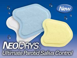 NEODRYS beats the competition in design, comfort, and value! They keep the parotid gland in check for over 15 minutes--far outlasting cotton rolls and other absorbent pads. New Comfort Edge techonology maximizes patient comfort while the poly backing protects the cheek. Work productively while performing sealants, composites, cementations, crown & bridge, amalgam preps, impressions, orthodontics, and laser dentistry. Available in tow sizes: large(blue), and small(yellow). For details and product samples call Microcopy at 1-800-235-1863. Order online at http://www.neodrys.com/.