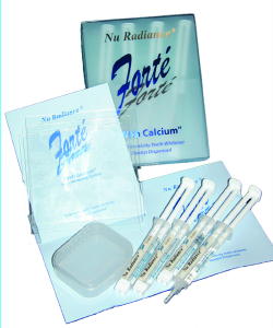 The Nu Radiance Forté Whitening System is a dentist-provided, tray-based, take-home whitening product that uses calcium peroxide to boost the whitening effect while providing calcium compounds to remineralize the teeth and to reduce the dentinal fluid flow, a major cause of tooth sensitivity. Forté, a catalyzed 30-minute whitener, has been successfully used by thousands of patients during the past two years. It uses a dual barrel syringe to dispense freshly mixed gel, a combination of 14% calcium peroxide and 30% carbamide peroxide, at each application. Recent innovations also include multiple disposable tips to make dispensing very easy.