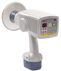 The NOMAD x-ray system is unique in that it is powered via rechargeable battery packs, similar to those used in cordless drills. The x-ray is light-weight and has internal and external shielding which allows the operator to safely take the x-ray exposure while standing next to the patient. The system is available in a sturdy travel case with pull-up handle and wheels, making it ideal for portable dentistry.
