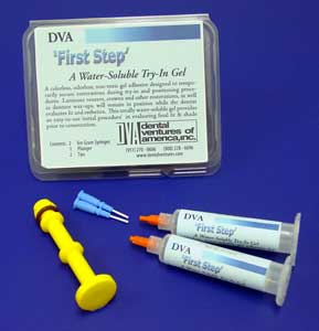 First Step is a colorless, odorless, non-toxic gel adhesive designed to secure restorations during try-in procedures. The water-soluble, gel adhesive is easily removed form all surfaces initially and after the try-in procedure is completed. Laminates, crowns, and other restorations as well as denture wax-ups are held in situ while the dentist and patient can evaluate the fit and esthetics. A true shade evaluation is possible, as the colorless gel will not influence the shade of the restoration. Any remaining residual material on the restoration burns-out without contamination if a baking/firing procedure is required.