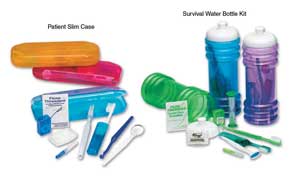 Masel offers two oral hygiene kits that give orthodontic patients everything they need.  Choose the Survival Water Bottle Kit or Patient Slim Case style. Both kits are easy to travel with and store.