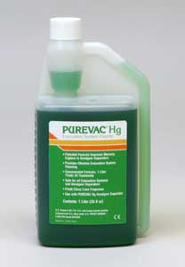 The PUREVAC® Hg Evacuation System Cleaner is the only cleaner available on the market proven to bind smaller particles of mercury into larger ones making it possible for amalgam separators to capture. Its non foaming formulation and pH of 9 make it safe for use in any suction system and amalgam separator. It effectively cleans evacuation system with the power of America’s #1 evacuation system cleaning brand - PUREVAC®.